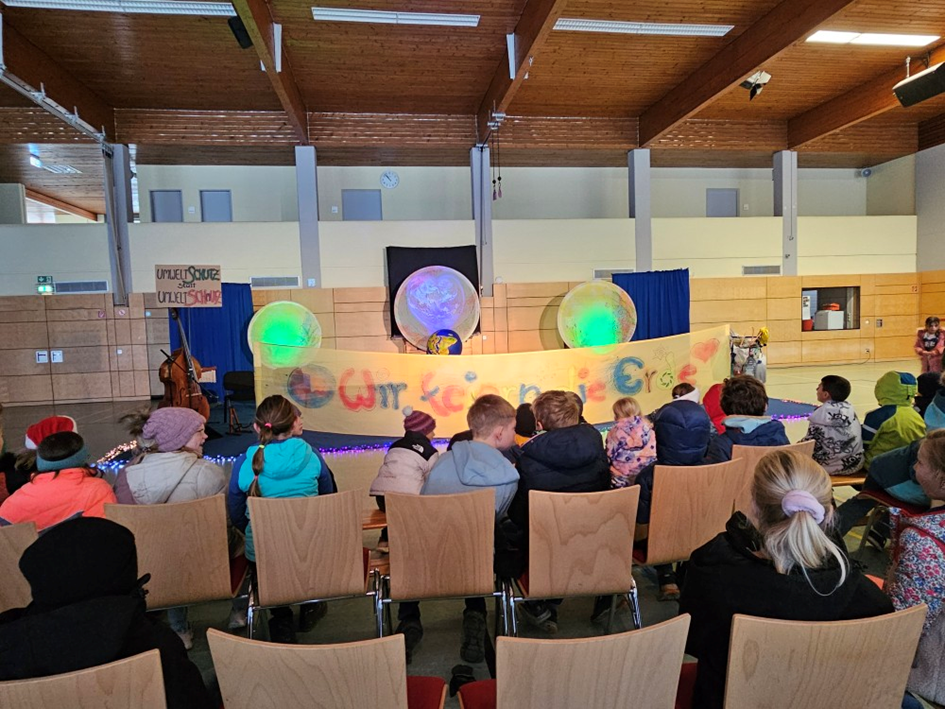 Am 03.12.2025 war das Radelrutsch-Theater zu Gast an der Grundschule Zaberfeld. Die Schule hatte sich erfolgreich über die Kreissparkasse Heilbronn für das Projekt der Klimastiftung beworben. Mit dem Titel „Happy Earthday! / Wir feiern die Erde“ präsentierte das Ensemble in der Mehrzweckhalle sein Stück mit Augenmerk auf Themen wie Müll, Wasser, Energie, Luftverschmutzung und Umweltschutz. Die Zuschauer wurden dadurch zu eigenem Engagement für eine nachhaltige Zukunft motiviert – danke an das Mut-Mach-Musical!